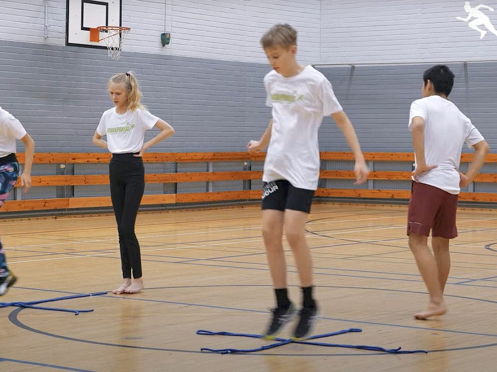 3. Ristikko-hyppely kiertäen. Jalat: ristiin-haara-ristiin-haara jne. alk. 0.50