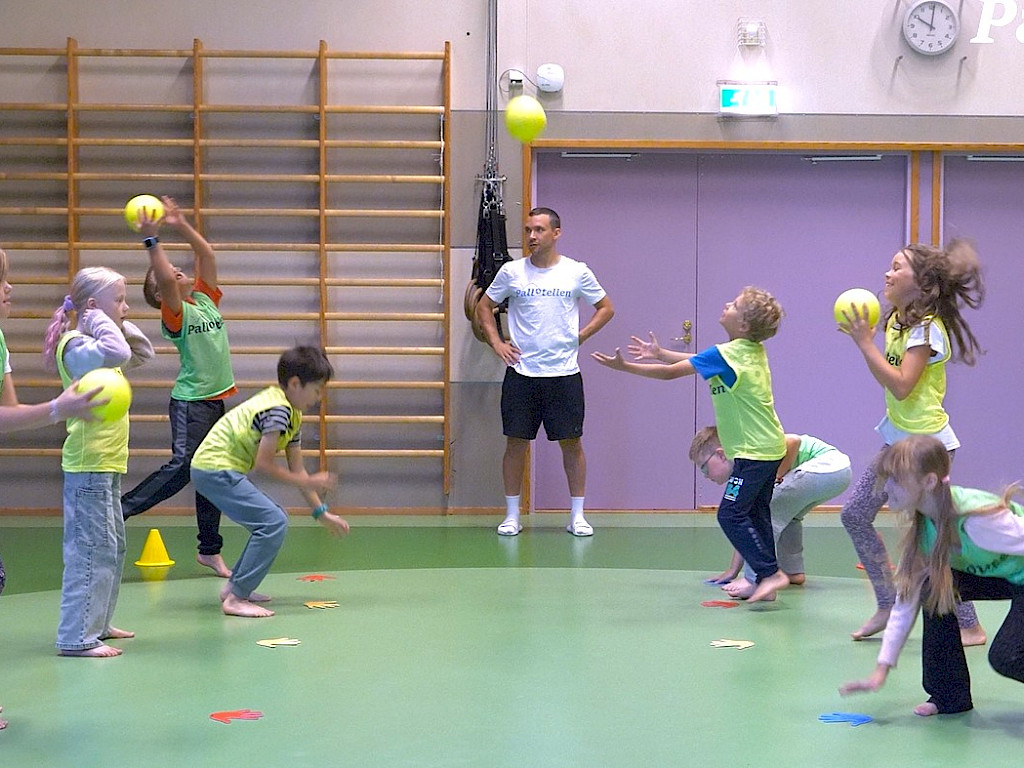 - Heitetään pallo parille ja sen jälkeen kosketetaan kämmenellä lattiaa.