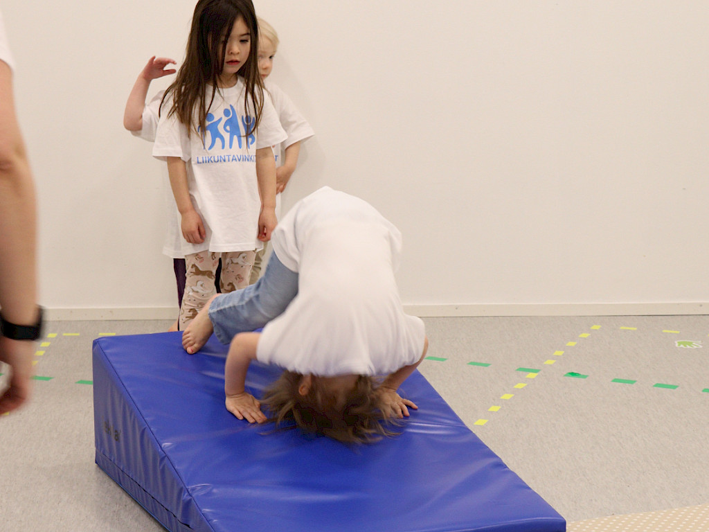 - Lapsi asettuu kyykkyyn korokkeen päälle, leuka rintaan ja kämmenet alustaan.