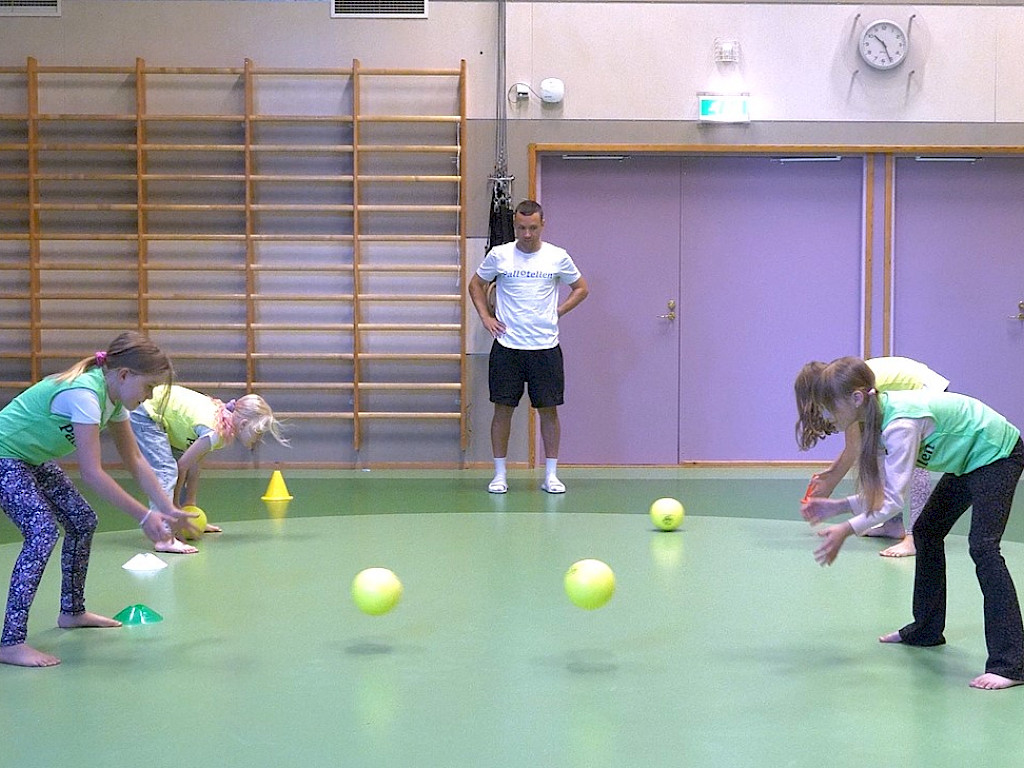 - Vieritetään pallo lattiaa pitkin parille suoraan eteenpäin, parin vierittäessä oma pallo myös suoraan eteenpäin.